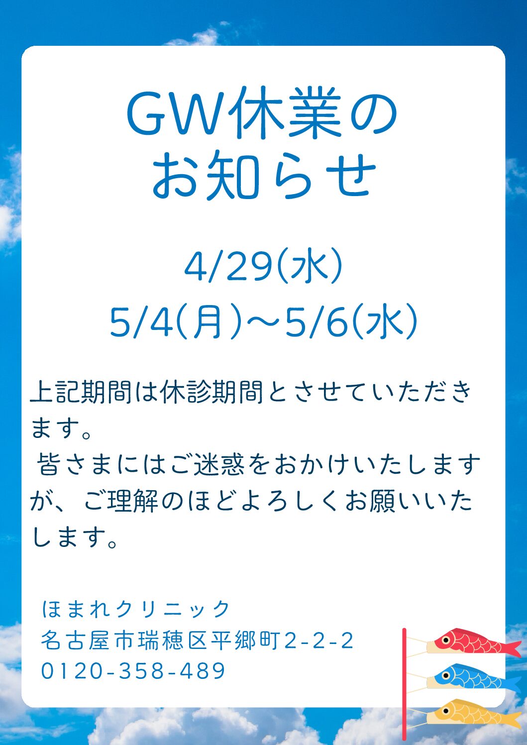 当院では、下記の期間をゴールデンウィーク休診とさせていただきます。